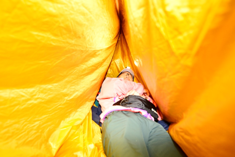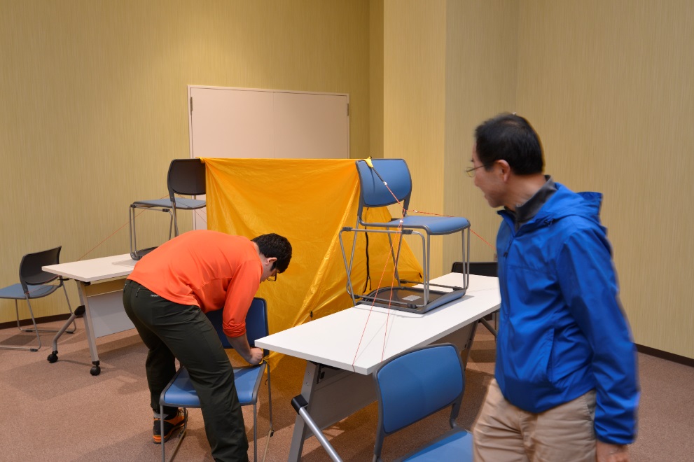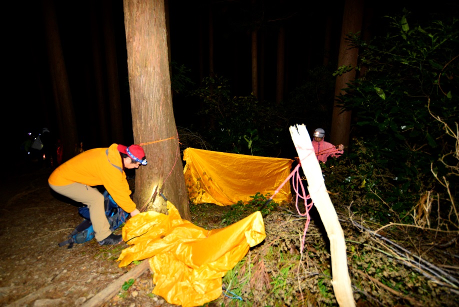 講習内容としては、上村ガイドが過去の山岳事故や貴重な経験談を交えながら下山の遅れなどの緊急時の際、夜間歩行やビバークについて必要性を話しをしていただいたり実際に高尾で夜間歩行やツェルトの使い方を体験しました。
