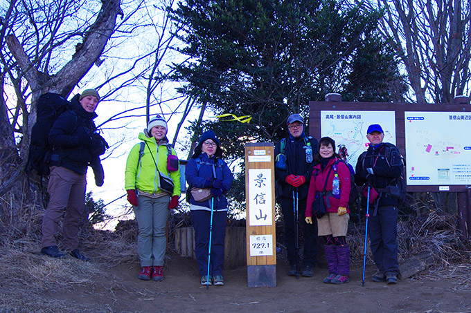 景信山(727.3m)は三等三角点のある見晴らしの良い山。茶屋もあり休日は大変なにぎわいますが、この時間なら貸し切り!