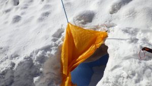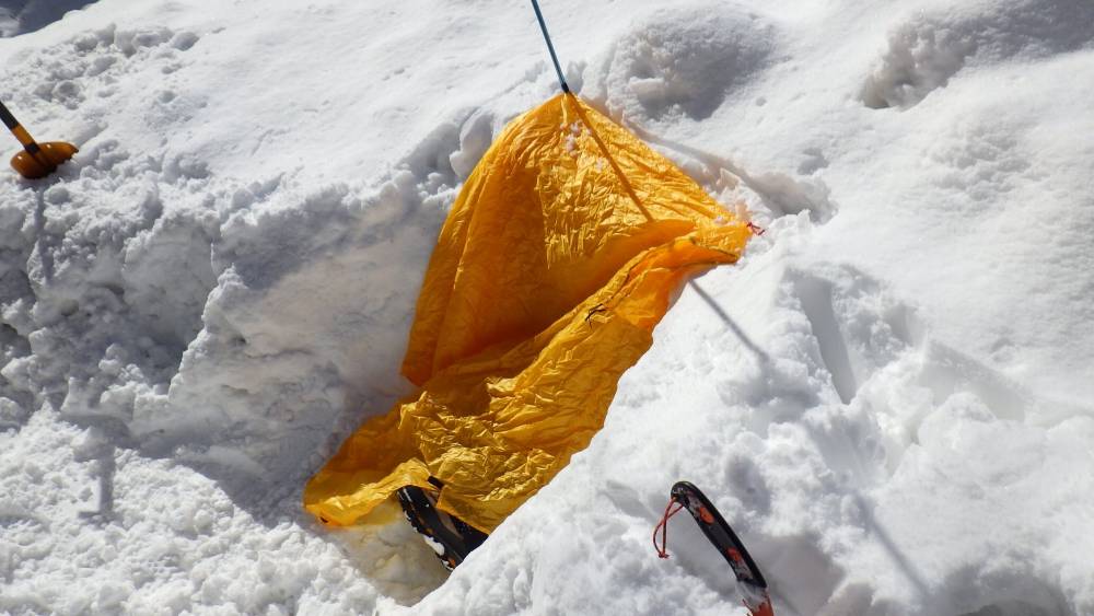 「ツェルト」は大切です。写真のツェルトはポンチョのように被る小さな物です。張れなくとも、被るだけでも違います。