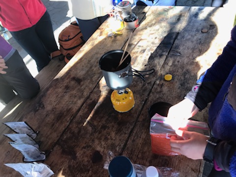 使い終わったコッヘルは、フランスパンでふき取って食べながら片付けたり、お湯を沸かして、ややカレー風味のコーヒーや紅茶を飲んでしまうなど、スイーツのマシュマロを食べながら、最後までしっかり学べたかと思います。