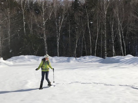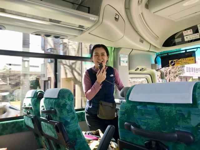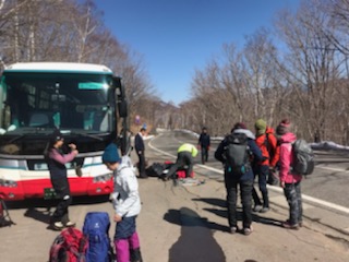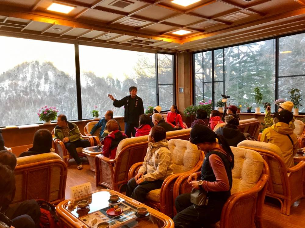 松本店でレンタル用のスノーシューをピックアップした後は、乗鞍高原へ向います。バスの中では、朝日旅行の内海さんの進行から佐智ガイドへバトンタッチ!