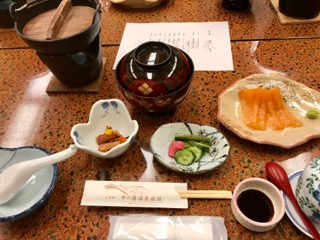 中の湯温泉旅館に着くと、温かいお茶とお菓子でおもてなしをしていただきました。フロントからの景色もとても綺麗です。