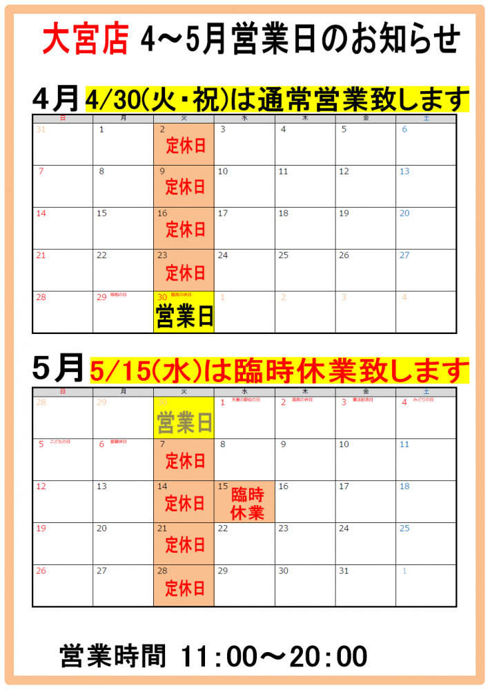 ・2019年4月30(火・祝)は火曜日ですが通常営業致します。