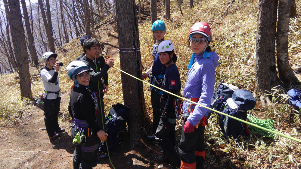 途中、崖になったところで、ムンター(※)での吊り下ろし、引き上げシステムのトレーニングを行いました。