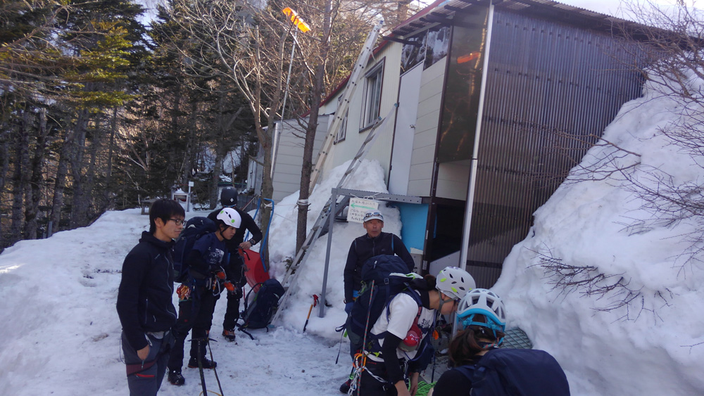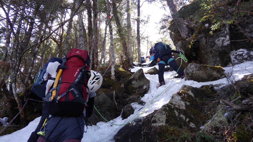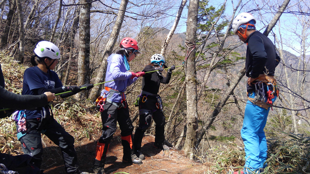 下山途中、笹ノ平で懸垂下降、再度引き上げ練習を2グループに分かれ実施した。懸垂下降は経験の差はあったものの、引き上げ要領も前日と比べ全般的にスムーズにできていたのではないかと思う。しかし、各人1回ずつの練習だったのでしっかりと復習して、次回のトレーニングではさらにスムーズにできるように習熟しておかなければならない。また、トレーニング最後に奥田ガイドから与えられた宿題も、確実にできるようにして次回に臨みたい。
