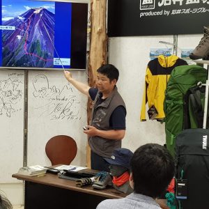 富士山の楽しみ方、装備、注意事項、事前準備などについてスライド写真や実際の装備品を見ながら説明します。