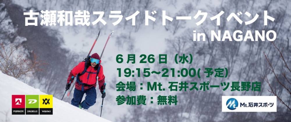 3年間フォトグラファーの菅沼浩さんにチームシューティングで撮影していただいた作品を使って、古瀬さん独自目線での雪山の楽しみ方や道具の話等を語ります。雪山を愛し、愛された男のマニアックなトークショーです。