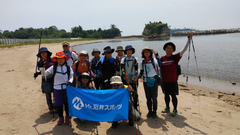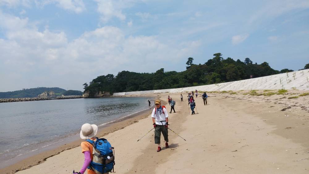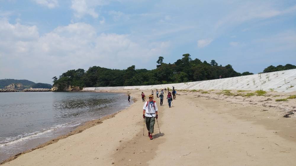 寒風沢島にて、『日和山展望台』、江戸時代に港を守るための『砲台跡』を経て、『前浜』を歩きます。気持ちの良い歩きやすい砂浜です。