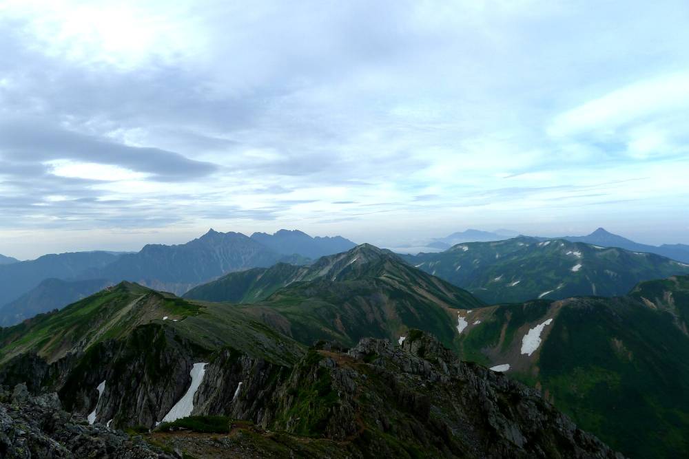 水晶岳から鷲羽岳、三俣蓮華、双六岳を望む