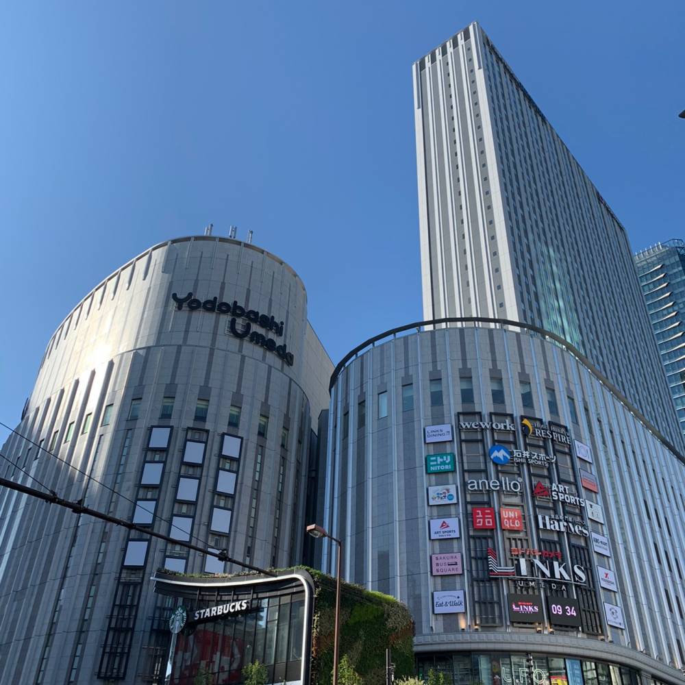 11/13(水)LINKS梅田(リンクス梅田)の内覧会が開催されました。快晴の大阪、青空に向かってそびえ立つのがリンクス梅田の建物です。(ちなみに右側のとりわけ高い建物は「ホテル阪急レスパイア大阪」で11/27(水)開業とのことです)