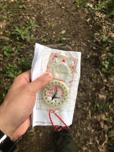 尾根、谷、ピーク、コル、等高線、磁北線などをざっと学び、コンパスの使い方もその場で覚えます。