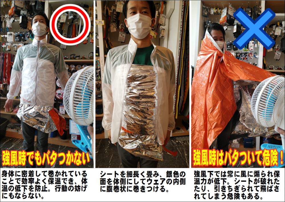 ちなみに昨年の海外のレースでは荒天でとても強い風だったため、せっかく持っていたエマージェンシーシートが千切れて飛ばされてしまい役に立たたず大量の遭難者を出すという痛ましい事故がありました。そのような時の対処法として銀色の面を体側にして腹巻状身につけ、その上にジャケットを着用すると体幹部の体温低下を防ぎ、行動を妨げずとても有効です。