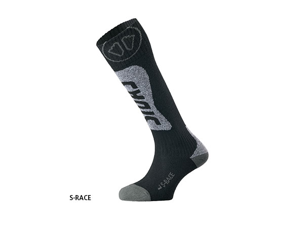 インソールと並んで注目してもらいたいのが、シダスがラインナップするソックスです。シダスでは雪の自然のなかで不可欠な保温性と通気性、さまざまな動きから足を守るプロテクション機能、フィット感やパワー伝達性、操作性などを、スキースタイルに合わせてコントロールしたソックスを開発。レーサーにはよりシビアな足裏感覚を追求した「S-RACE(Sレース)」を、一般スキーヤーにはさまざまなシチュエーションでの快適性を重視した「S-ALPINE(Sアルパイン)」をラインナップしています。インソールと併せて使うことで、ブーツ内での足のズレを最小限に抑えることができ、より効果的なパワー伝達や操作性の向上が期待できます。