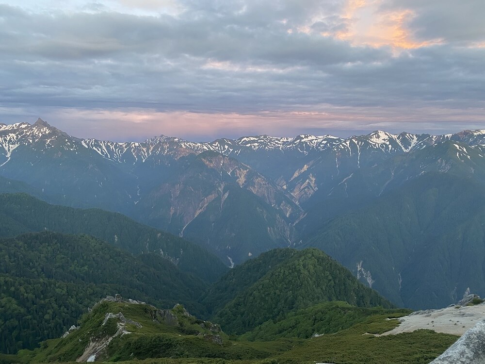 槍ヶ岳や笠ヶ岳、双六岳、鷲羽岳、水晶岳、野口五郎岳、烏帽子岳などが見える大展望