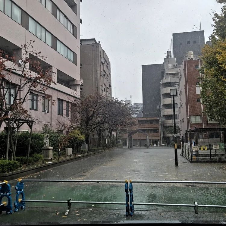 建物の軒下で雨宿り。