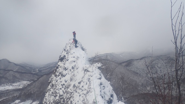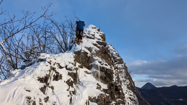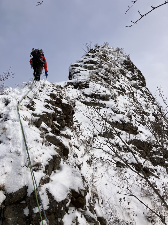 細い稜線をビビりながら歩き、6Pロープを出して無事にピークまで。