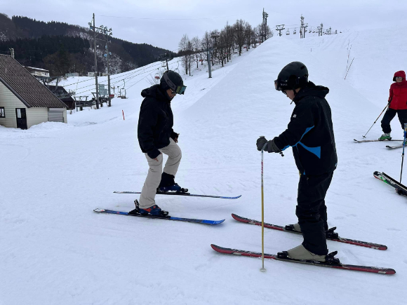 迎えの車内では緊張を隠し切れない彼ですが、早速ブーツやスキー板の履き方、移動方法や姿勢など、基本動作をプロ級の先輩スタッフから指導を受けます👍何と贅沢な時間😊