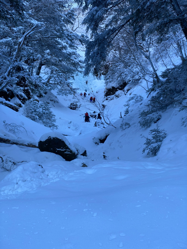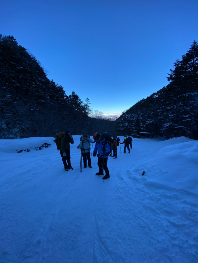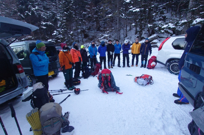 夏沢鉱泉ではアイゼンを装着し、人数が多いのでここで二手に分かれます。
