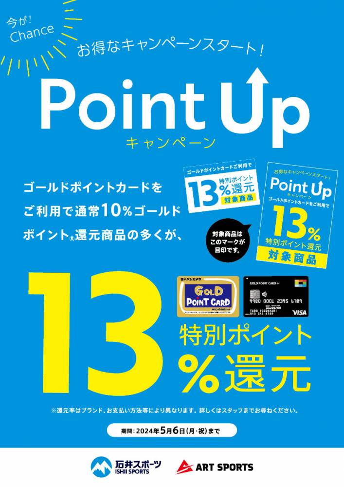 石井スポーツ・ヨドバシカメラでご利用いただける『ゴールドポイントカード』は通常10%還元ですが、現在キャンペーン中で特別ポイントを+3%上乗せした最大13%還元のお得なキャンペーンを開催しております!