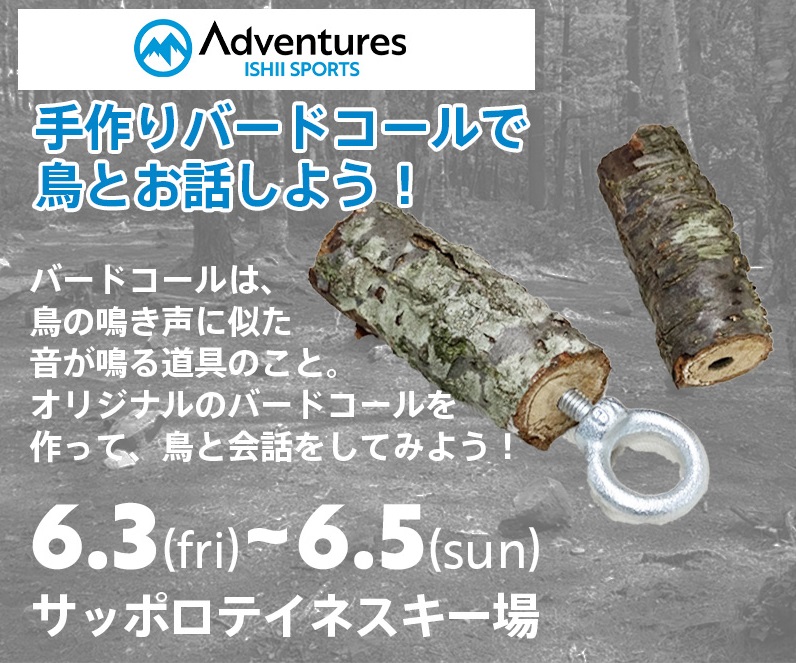 バードコールは、鳥の鳴き声に似た音が鳴る道具のこと。オリジナルのバードコールを作って、鳥と会話をしてみよう!石井スポーツアドベンチャーズブースにて実施!
