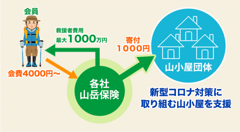 登山者が安心して安全登山を行うために山小屋はとても大切な存在です。 3 社はこのような状況を鑑み、今後も長く登山を楽しめる状況を守るため、「安全登山のための活動への寄付」として、会員の年会費 1 人につき 1000 円を山小屋支援のために寄付することに決定いたしました。