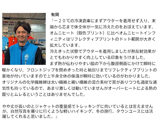 今回は石井スポーツスタッフ有岡が「オムニヒートインフィニティ」を使ったオークハーバーインシュレイテッドジャケットを着用し-20°cの中で温かさを検証しました。