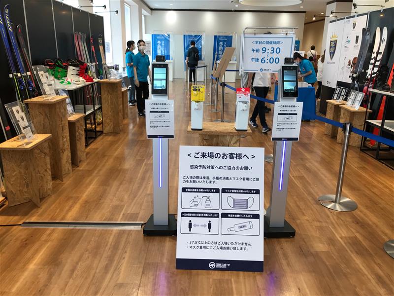 入口には感染症対策のアルコール消毒、検温器が設置されています。