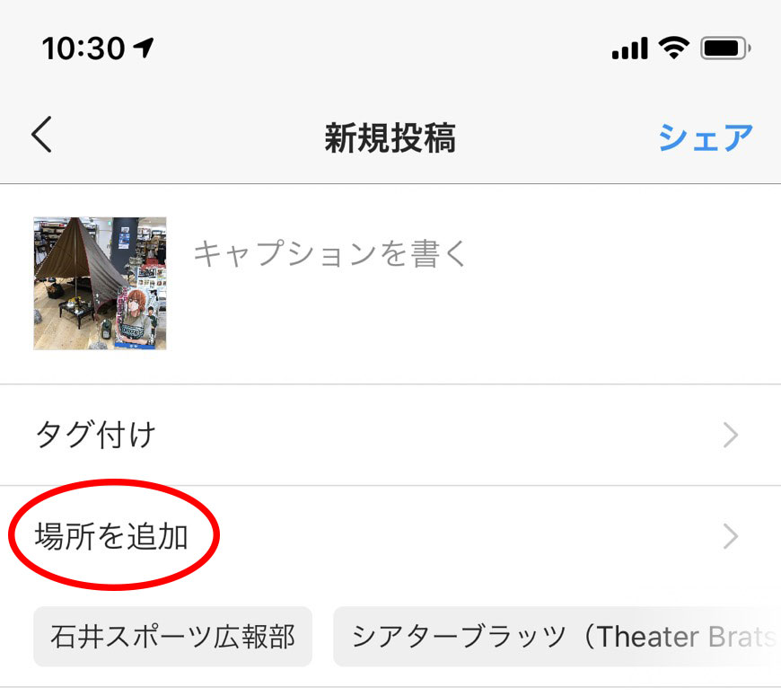 ③撮影した写真を選んだら、「場所を追加」をタップ! ※Androidの場合「位置情報を追加」をタップ